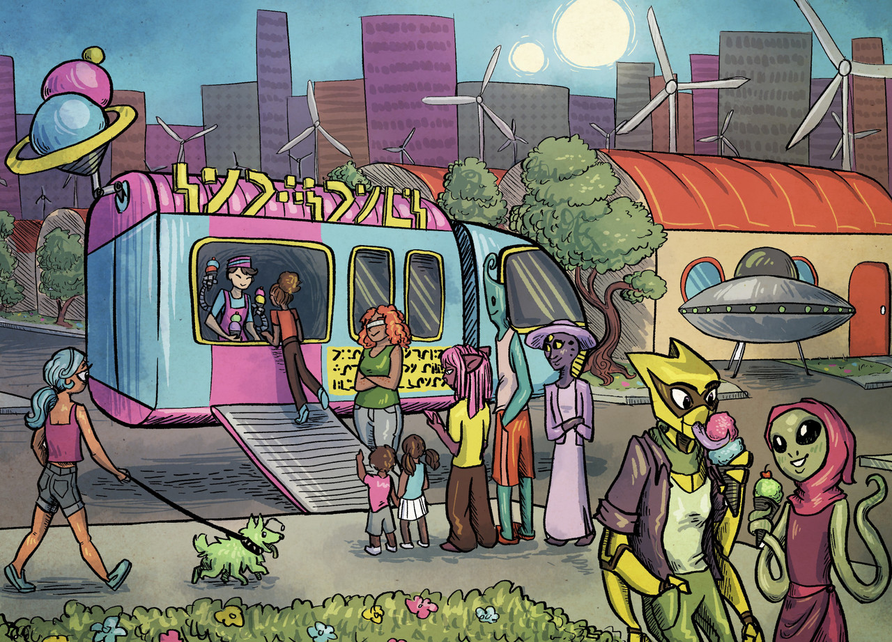 i should probably post an art shouldnt i. here's an alien snowcone truck i did for the krita kickstarter desk calendar (krita is some fantastic opensource digital painting software! https://krita.org/en/) https://mastodon.cc/media/IBM6iOHQJI4JuK4st4c